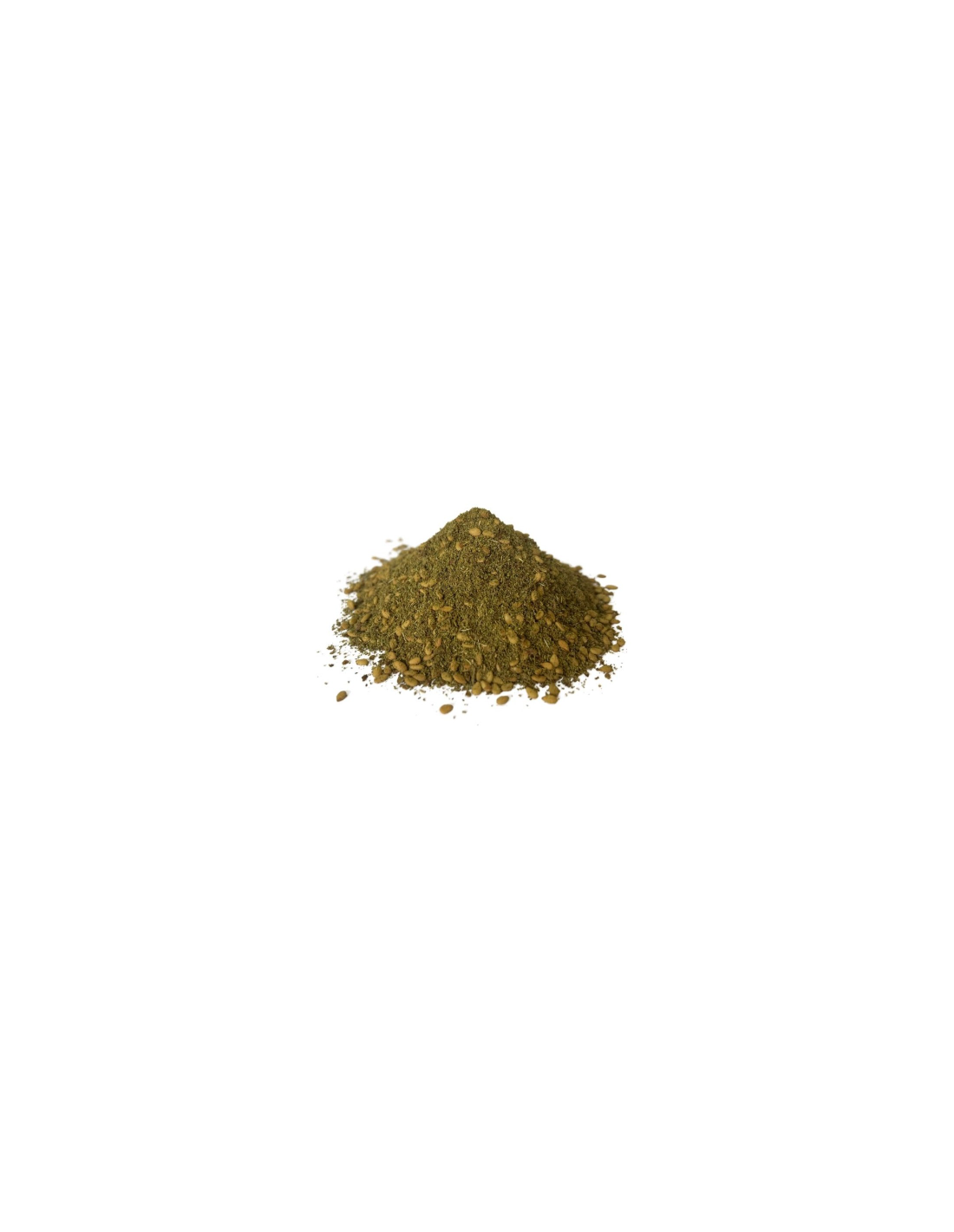 Mezcla de especias comino molido, tomillo molido, sésamo, sumac molido, ajedrea molida y sal.