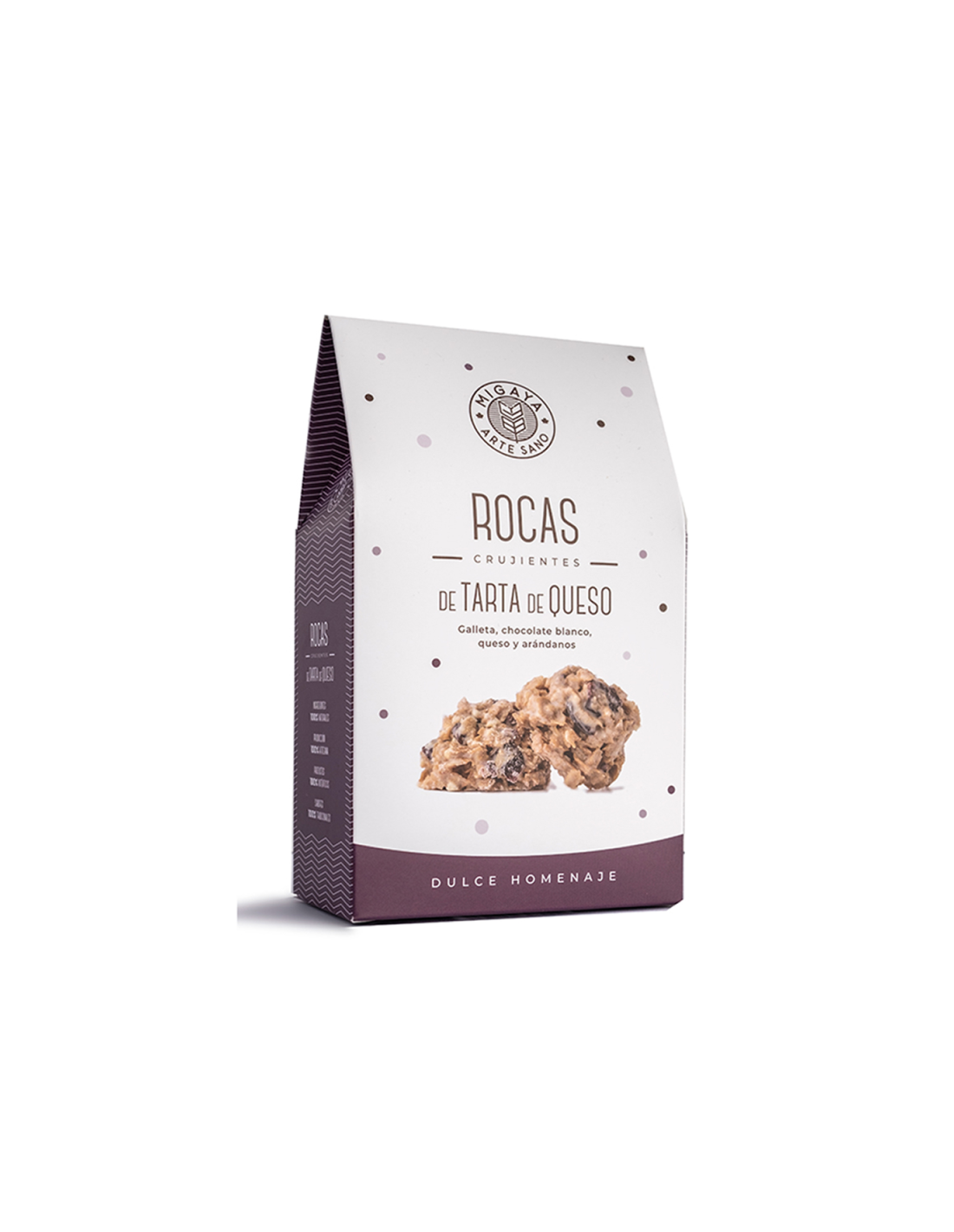 Rocas crujientes de galleta, chocolate blanco, queso y arándanos.