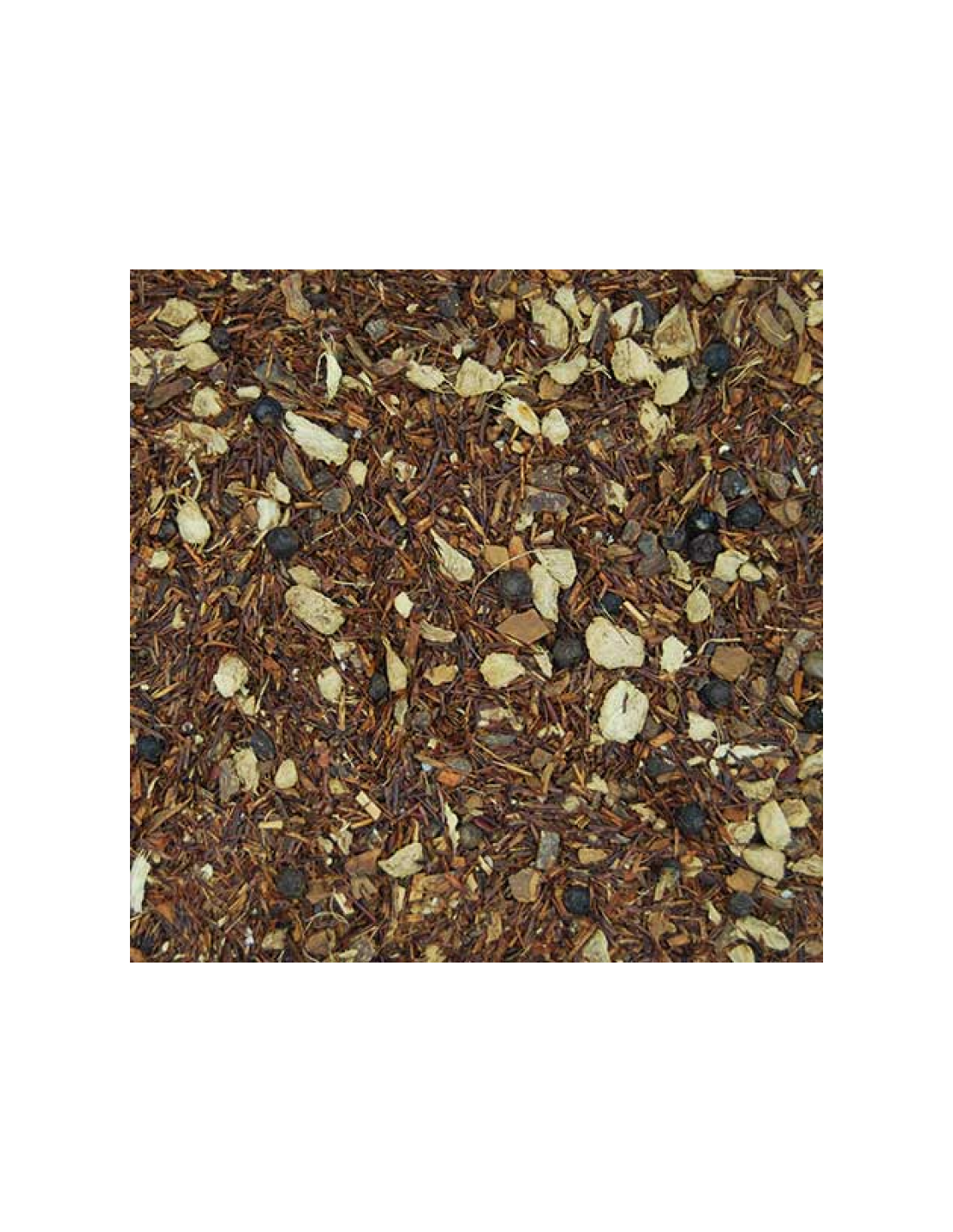rooibos, trozos de jengibre, trozos de canela, pimienta negra, semillas de cardamomo, raíz de regaliz (evitar exceso de consumo si sufre hipertensión), aromas naturales.