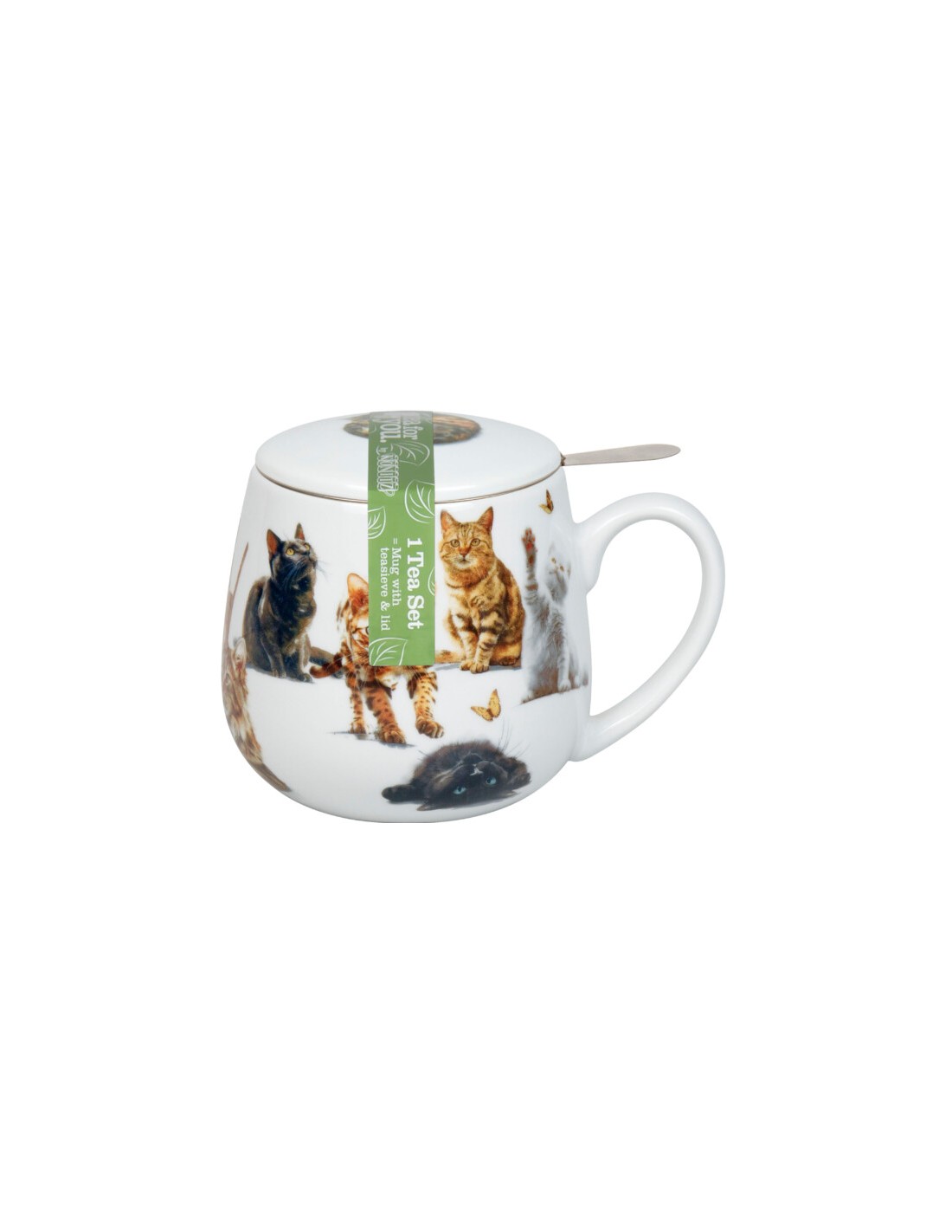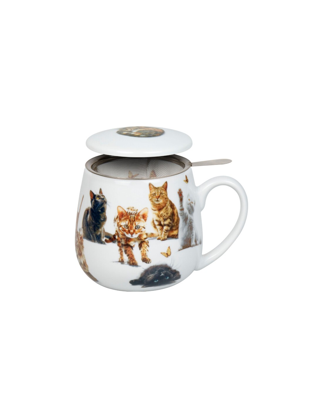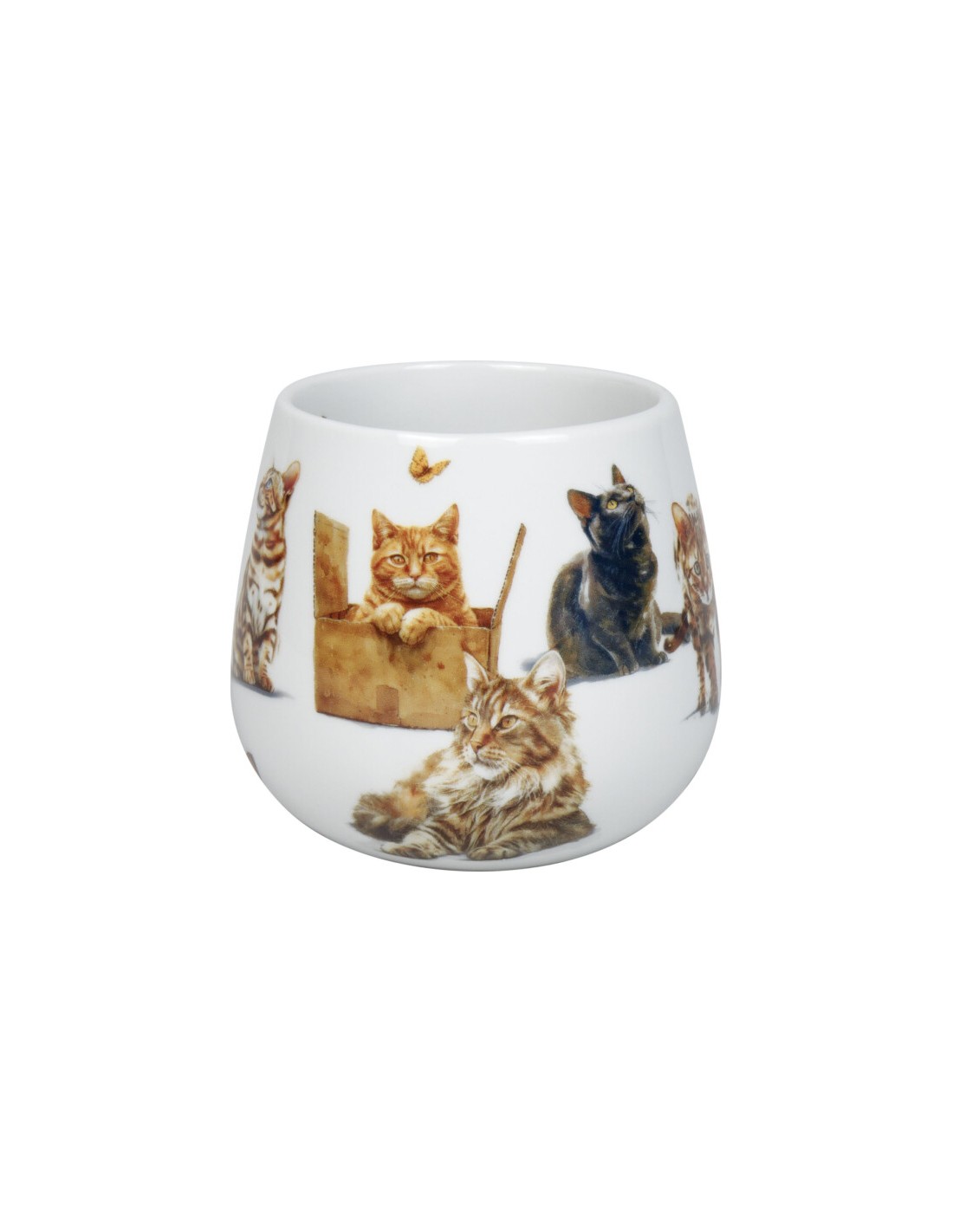 Esta taza tiene plasmada diferente tipos de raza desde curiosos gatitos persiguiendo una mariposa otros delsperezándose, por todo ello es perfecta para los amantes de los felinos.
