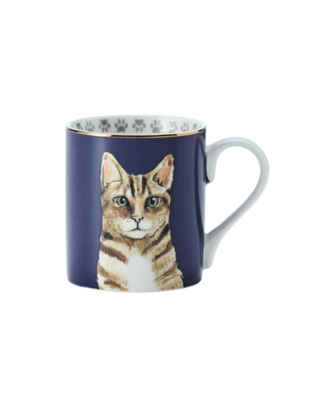 Con una adorable ilustración de un gato sobre un fondo azul marino, la taza tiene detalles de oro real en el borde y el mango, así como un patrón de pata dentro de la taza.