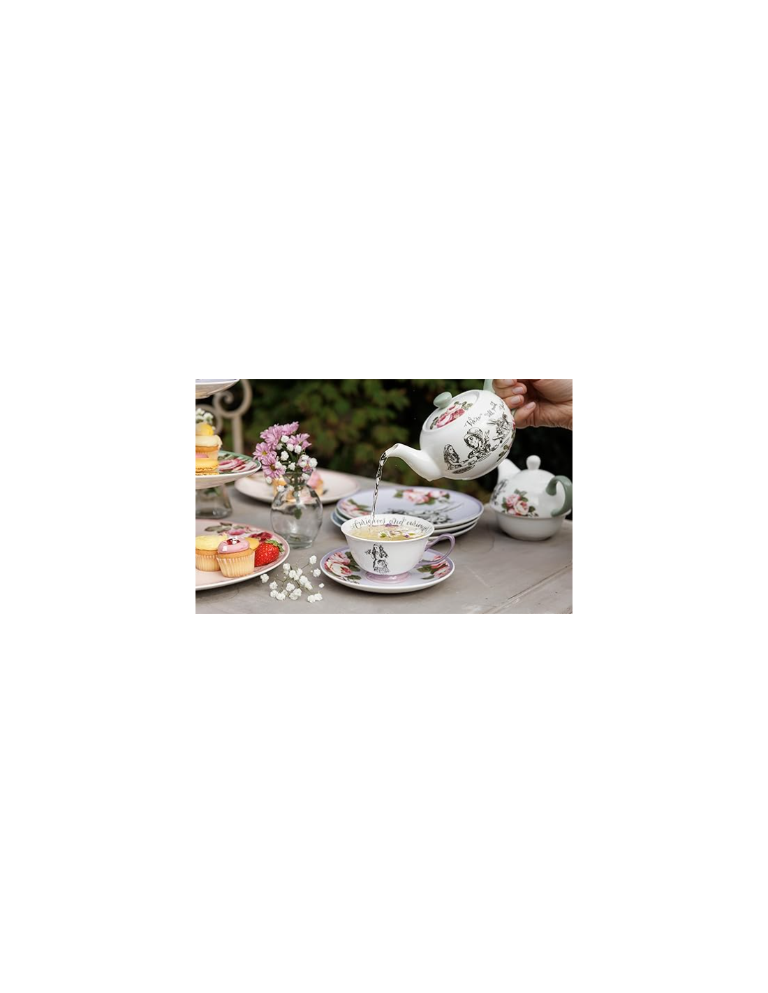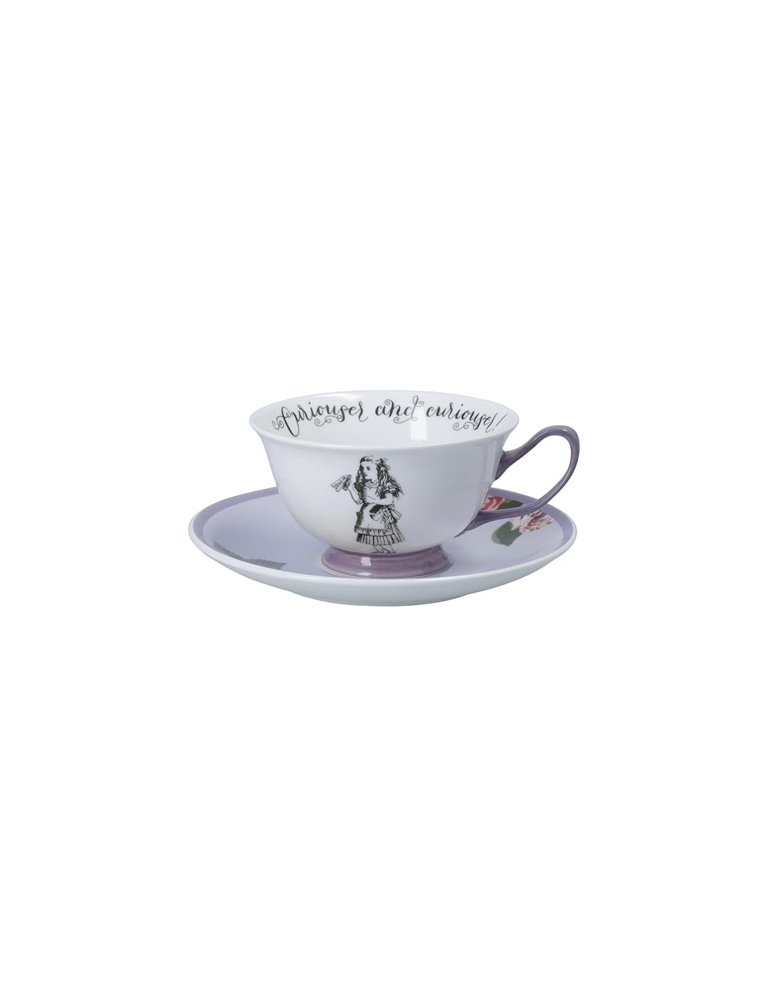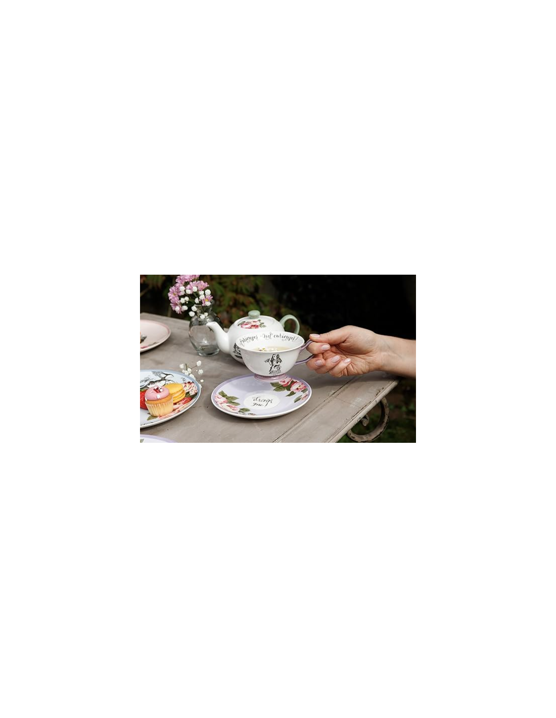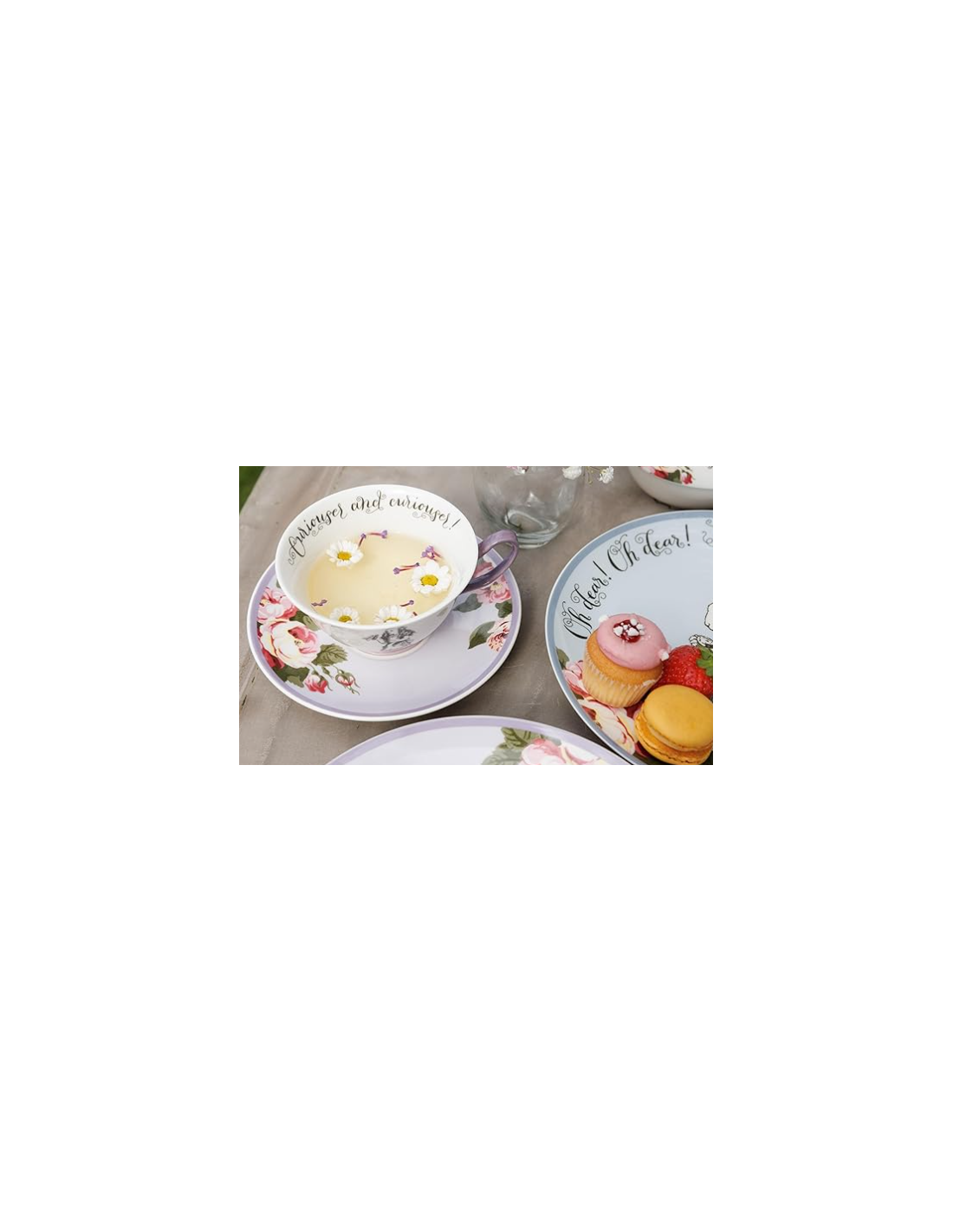 Taza de café espresso con plato de Alicia en el país de las maravillas