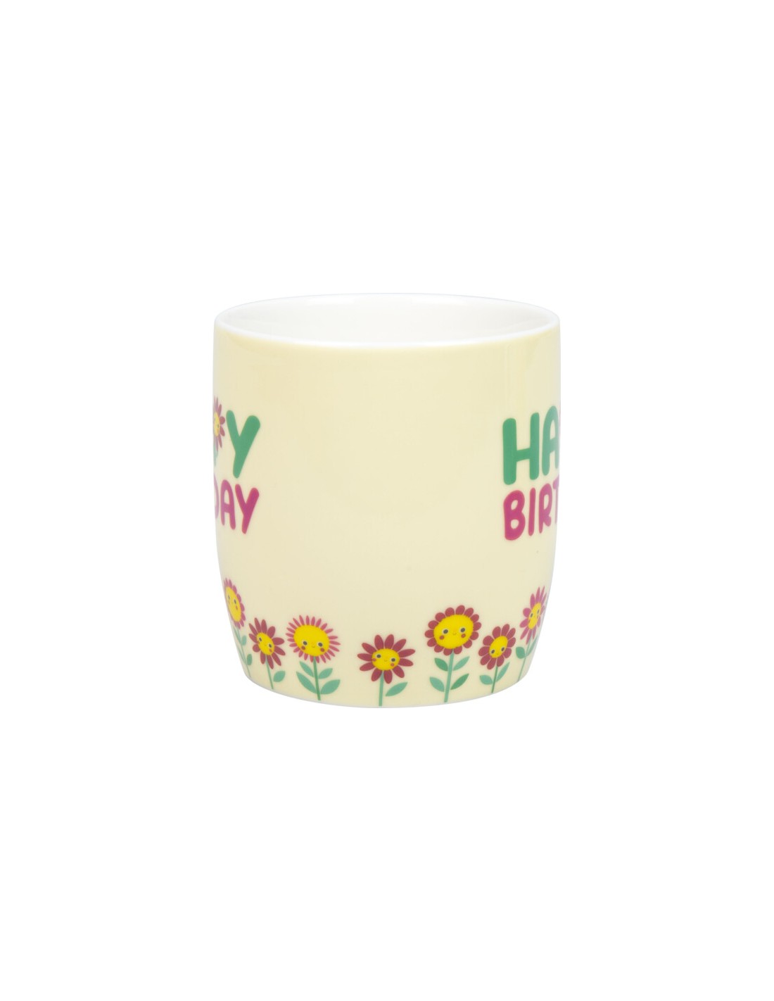 Taza fabricada en porcelana fina con el mensaje “Happy Birthday” sobre un tono vainilla que hace resaltar el mensaje y las flores que crecen de la taza.